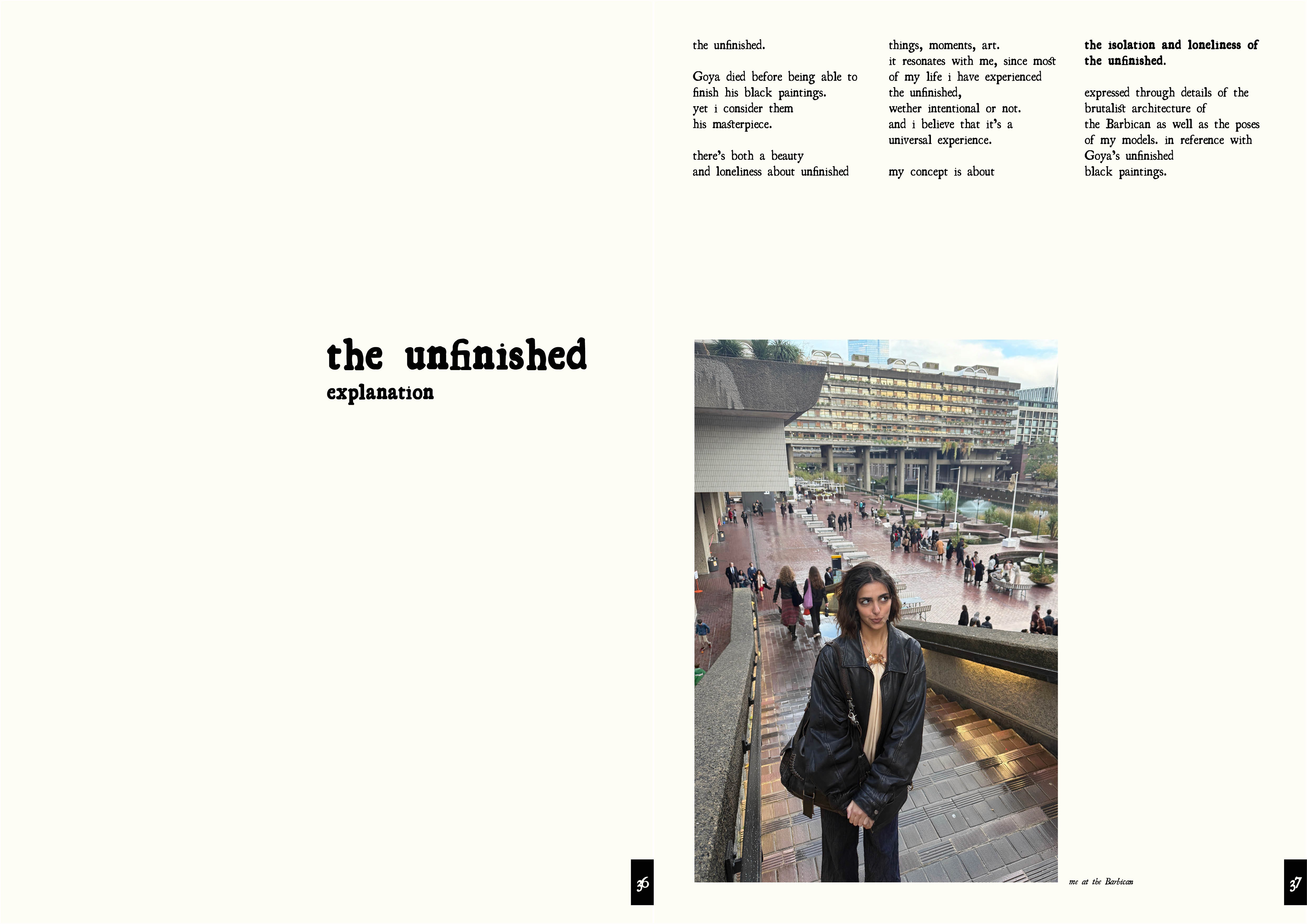by placing my images in dialogue with Goya's paintings, i wanted to show parallels between painting and photography. the Barbican's brutalist architecture functioned as a visual metaphor for emotional distance, using negative space, repetition, and scale to express isolation.